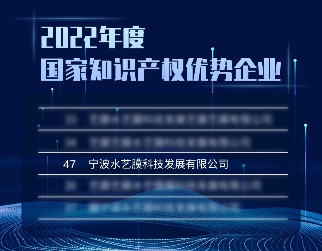 近日,國家知識產(chǎn)權(quán)局公布了2022年度國家知識產(chǎn)權(quán)優(yōu)勢企業(yè)和示范企業(yè)評定結(jié)果,水藝膜科技憑借過硬的研發(fā)創(chuàng)新和知識產(chǎn)權(quán)管理優(yōu)勢,榮膺“國家知識產(chǎn)權(quán)優(yōu)勢企業(yè)”稱號。