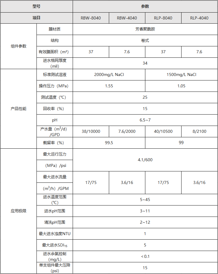 RLP系列:RLP是專門為去除無機(jī)鹽和有機(jī)小分子開發(fā)的反滲透膜,具有操作壓力低和脫鹽率高的特點(diǎn),適用于較低鹽度原水的脫鹽處理。